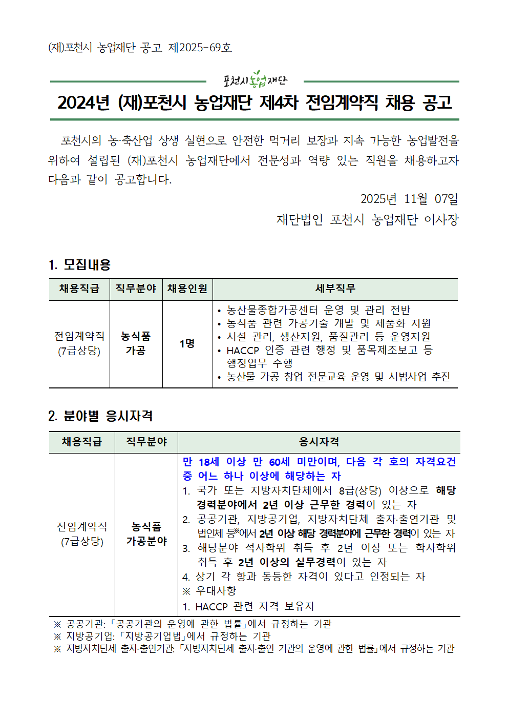 (공고문) [제2025-69호] (재)포천시 농업재단 2025년 제4차 전임계약 채용 공고(일정변경).hwp
