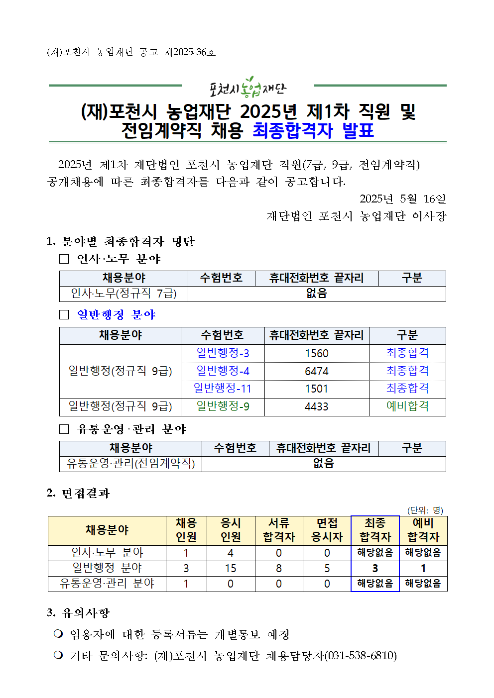 2025년 (재)포천시 농업재단 제1차 직원 및 전임계약직 채용 최종합격자 발표