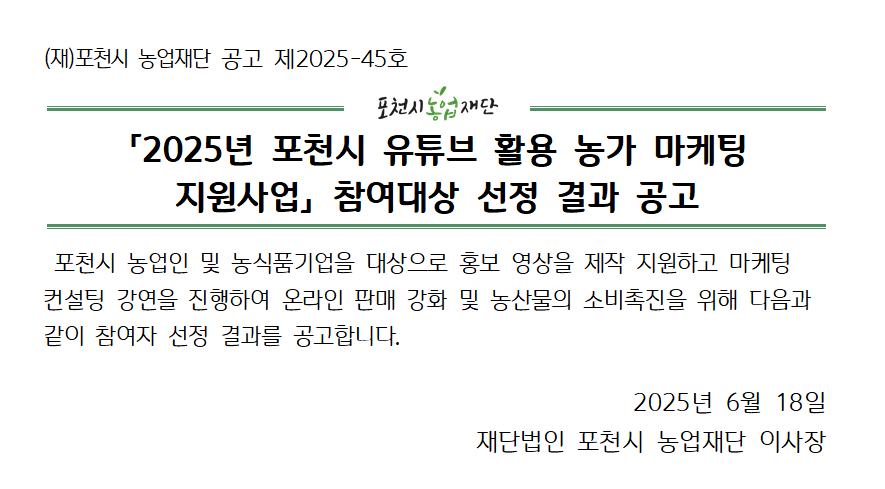 2025년 포천시 유튜브 활용 농가 마케팅 지원사업 참여대상 선정 결과 공고