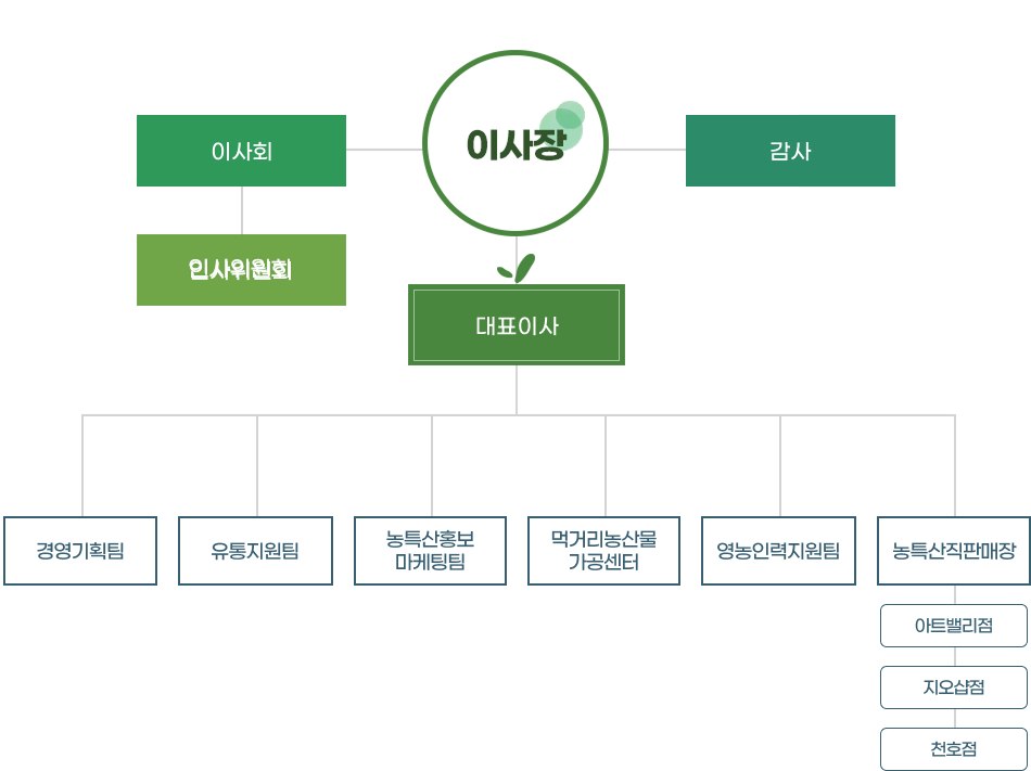 팀 업무 총괄 농특산물 판매장 운영 지원 업무 총괄 신규매장 타당성 검토 출하단체 및 출하자, 유관기관 업무 협의 매장 리뉴얼 및 신규오픈 관련 제반 업무 기간제(물류관리) 근로자 관리 |