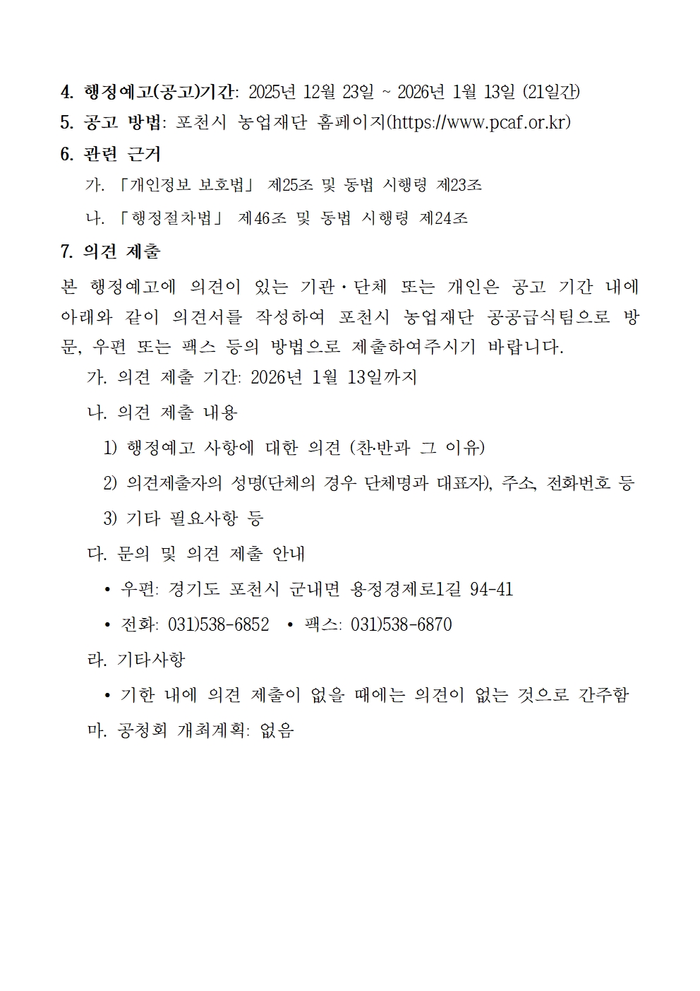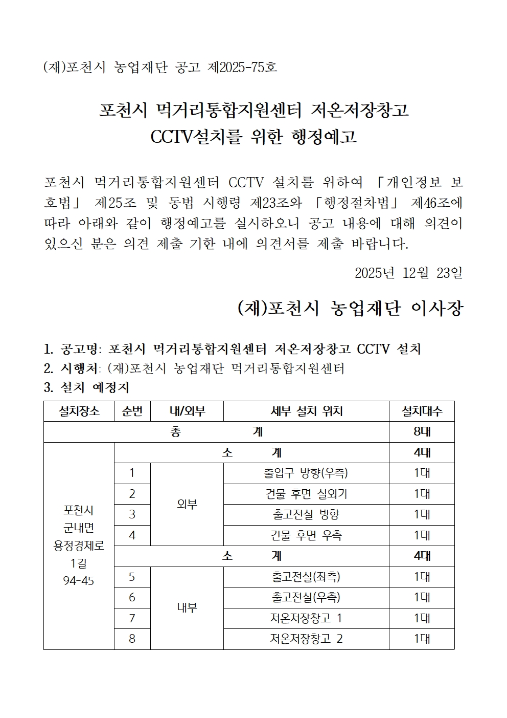 포천시 먹거리통합지원센터 저온저장창고 CCTV설치를 위한 행정예고