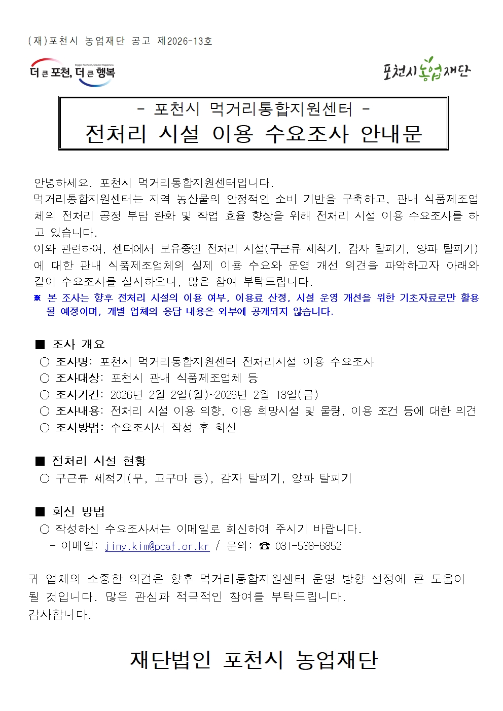 포천시 먹거리통합지원센터 전처리 시설 이용 수요조사 안내문