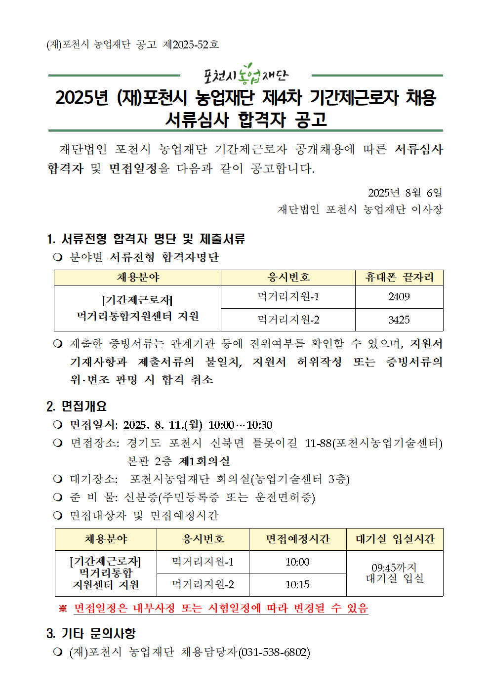2025년 (재)포천시 농업재단 제4차 기간제근로자 채용 서류심사 합격자 공고