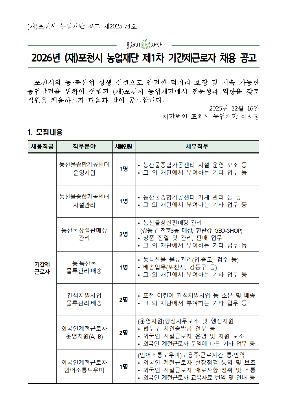 2026년 (재)포천시 농업재단 제1차 기간제근로자 채용 공고