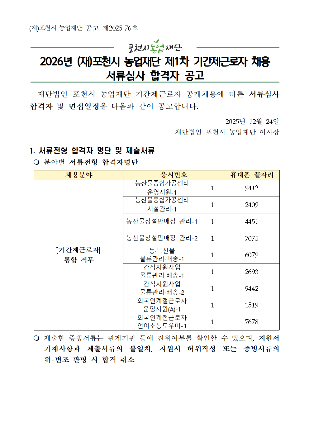 붙임1.(공고2025-76호) 2026년 제1차 기간제근로자 채용 재공고 서류합격자 발표 공고.hwp