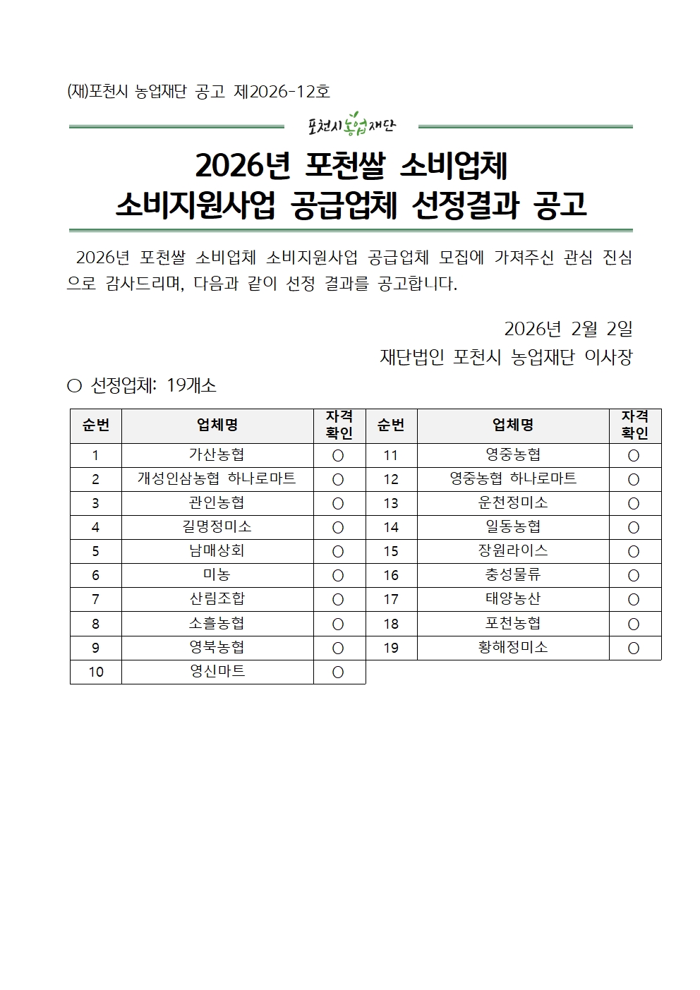 2026년 포천쌀 소비업체 소비지원사업 공급업체 선정결과 공고